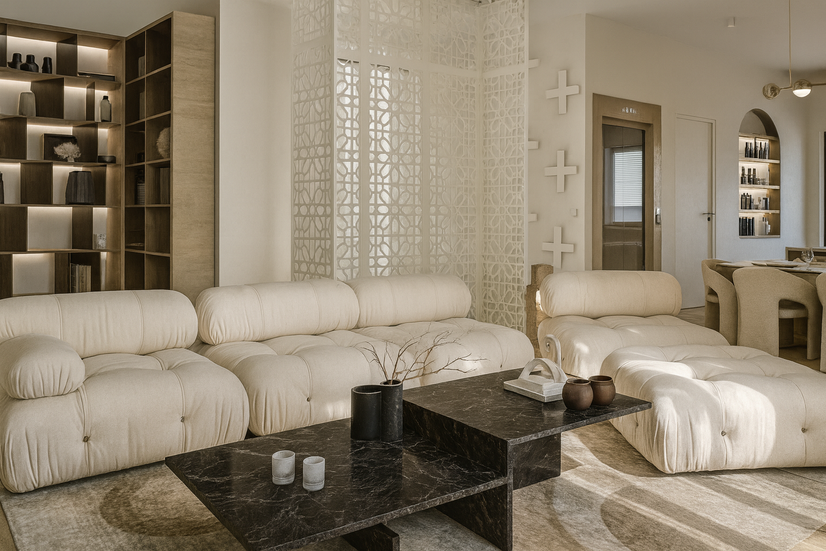 " Un intérieur contemporain où la lumière, les courbes et les matières sculptent un refuge d’élégance contemporaine, entre luxe discret et poésie architecturale."
